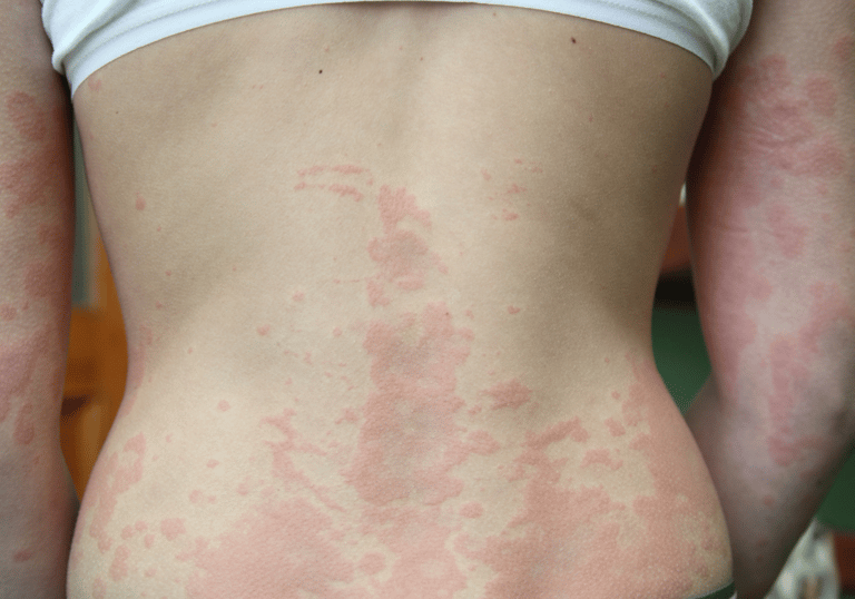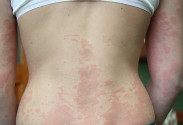Placas vermelhas que aparecem e somem em horas e coçam muito. Podem aparecer em qualquer lugar. Por vezes associada a angioedema na face.