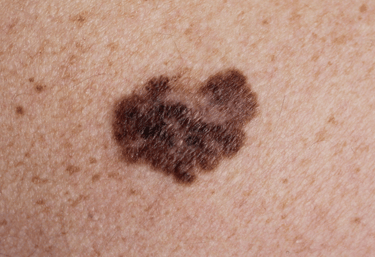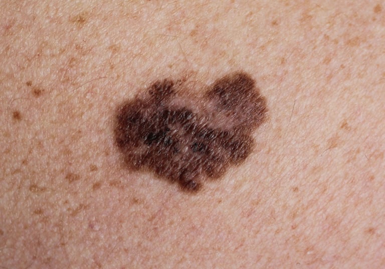 Câncer de pele que parece uma pinta diferente ou estanha. Pode ser grave e exige rapidez no diagnóstico e tratamento. Mais comum em áreas de queimaduras solares.
