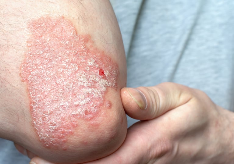 Placas vermelhas que descamam principalmente nos cotovelos, joelhos e couro cabeludo.