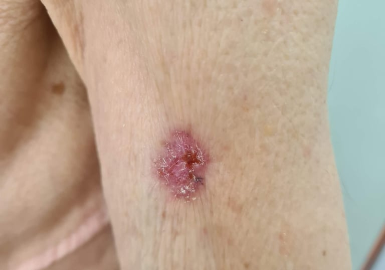 Mais comum em pessoas mais velhas, a lesão tende a ser mais "cascuda" e também machuca fácil. Comum nas áreas que pegaram sol a vida toda.