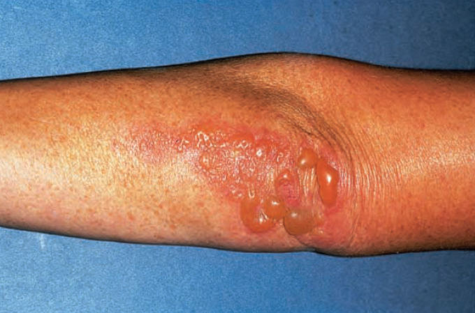 Bolhas e muita coceira principalmente nos cotovelos, joelhos e glúteos.