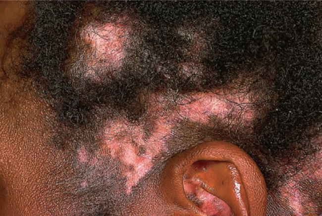 Placas de diferentes cores principalmente no rosto, orelhas e couro cabeludo.